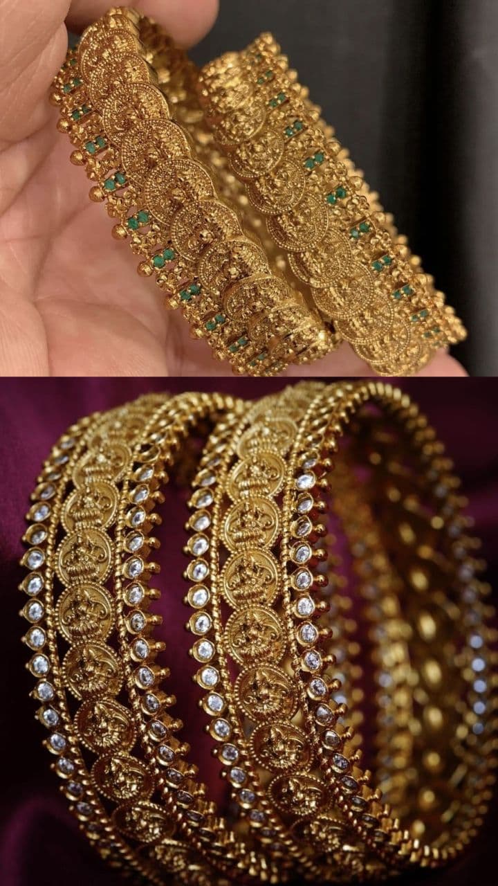 If you want a simple, sober and elegant piece, then you can also get such a link openable coin bangle. Near the link, there is a beautiful flower made of kundan and stones, which is enhancing the beauty of the link.