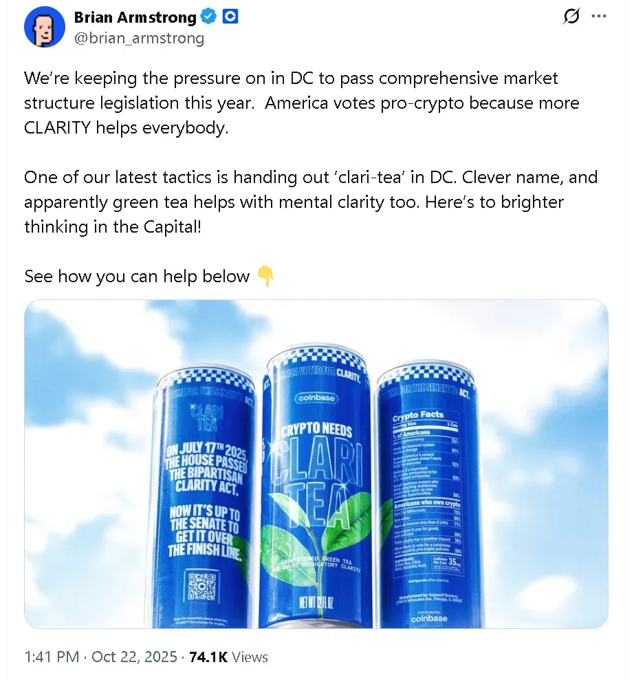 The comments come after Armstrong shared on Wednesday that Coinbase has used creative methods to engage legislators, including distributing “clari-tea,” a canned green tea brand. “Clever name, and apparently green tea helps with mental clarity too. Here’s to brighter thinking in the Capital!” he said.