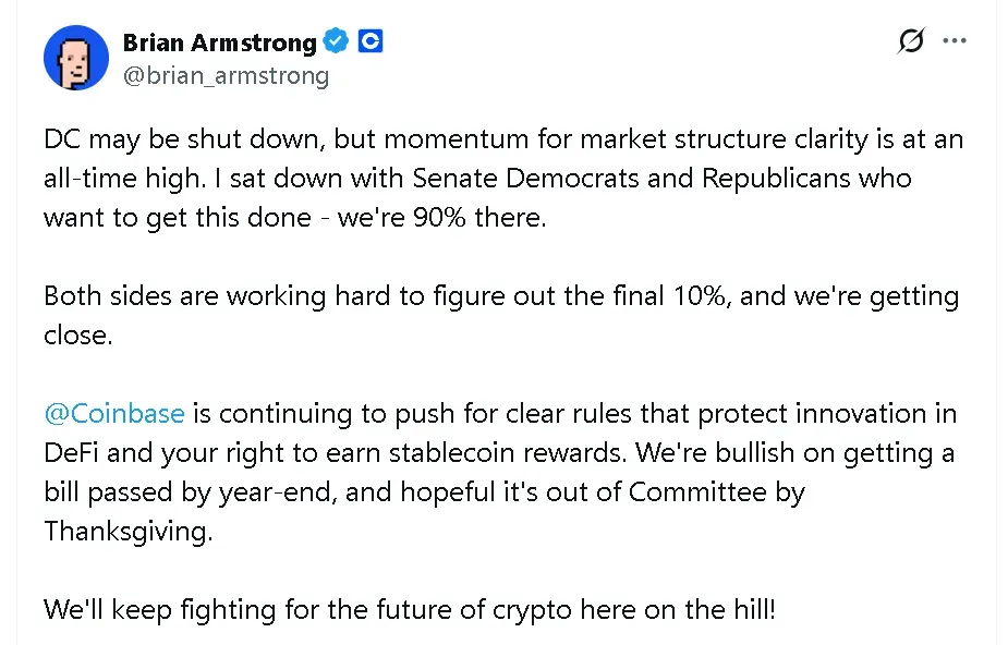 Armstrong noted that both parties are actively working to resolve the remaining 10% of outstanding issues. Coinbase is optimistic that the bill could pass by year-end, with committee approval possible by Thanksgiving. However, he did not specify which crypto bill was under debate.