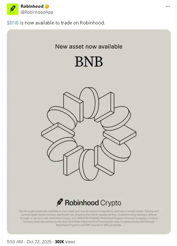 Earlier Wednesday, Robinhood made BNB available to its users, marking the token’s first listing on a major U.S. trading platform that day. The move positions Robinhood alongside Coinbase in providing additional trading options for U.S.-based retail investors seeking exposure to BNB and related DeFi projects amid the crypto-friendly regulatory environment under the Trump administration.