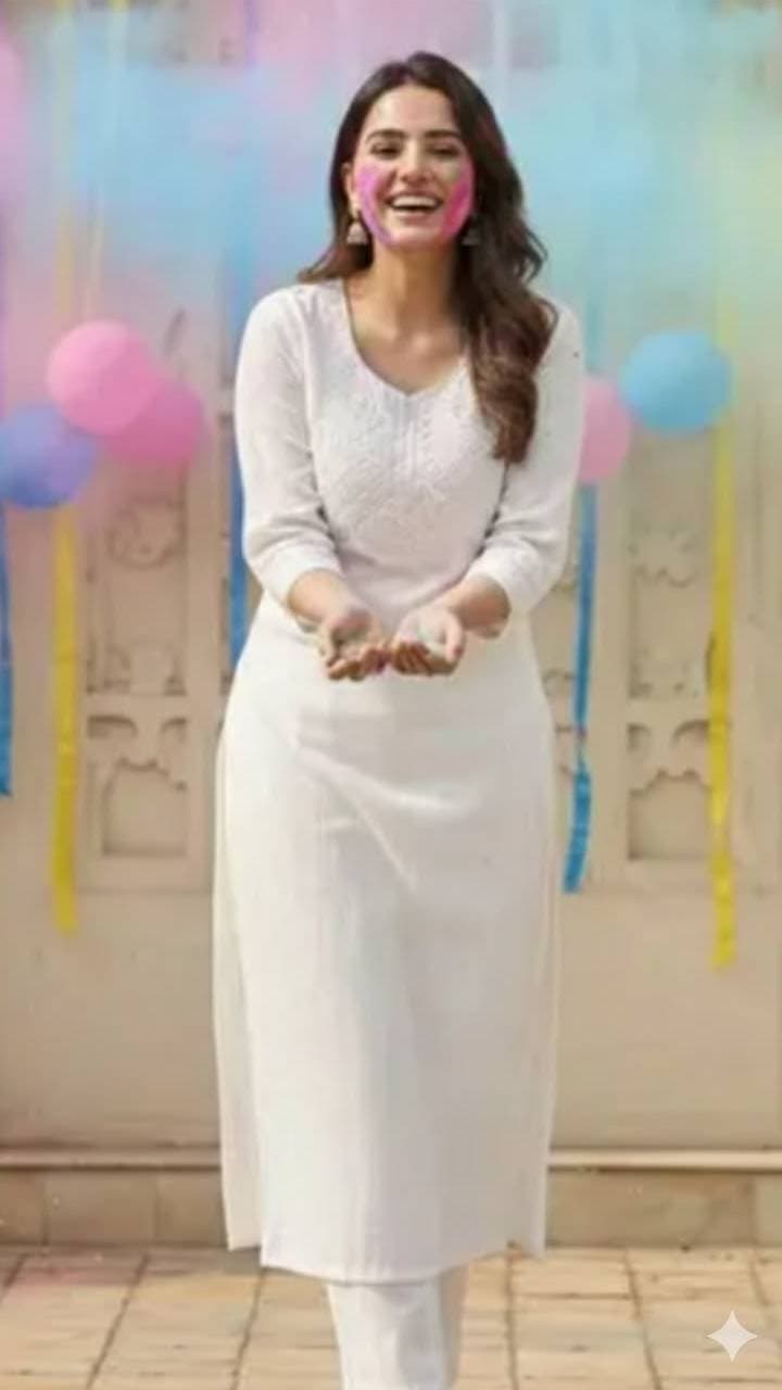 This off-white kurti with chikankari work is perfect for an office Holi party. It’s elegant, light and professional, and can be styled with palazzo or straight pants.