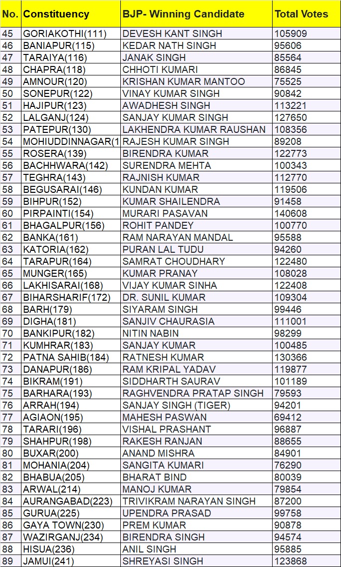 - BJP showed a strong hold in Narkatiaganj, Lauria, Rajnagar, Darbhanga, Motihari, Siwan, Hajipur, Patna Sahib, Begusarai, Bhagalpur – almost in entire Bihar.