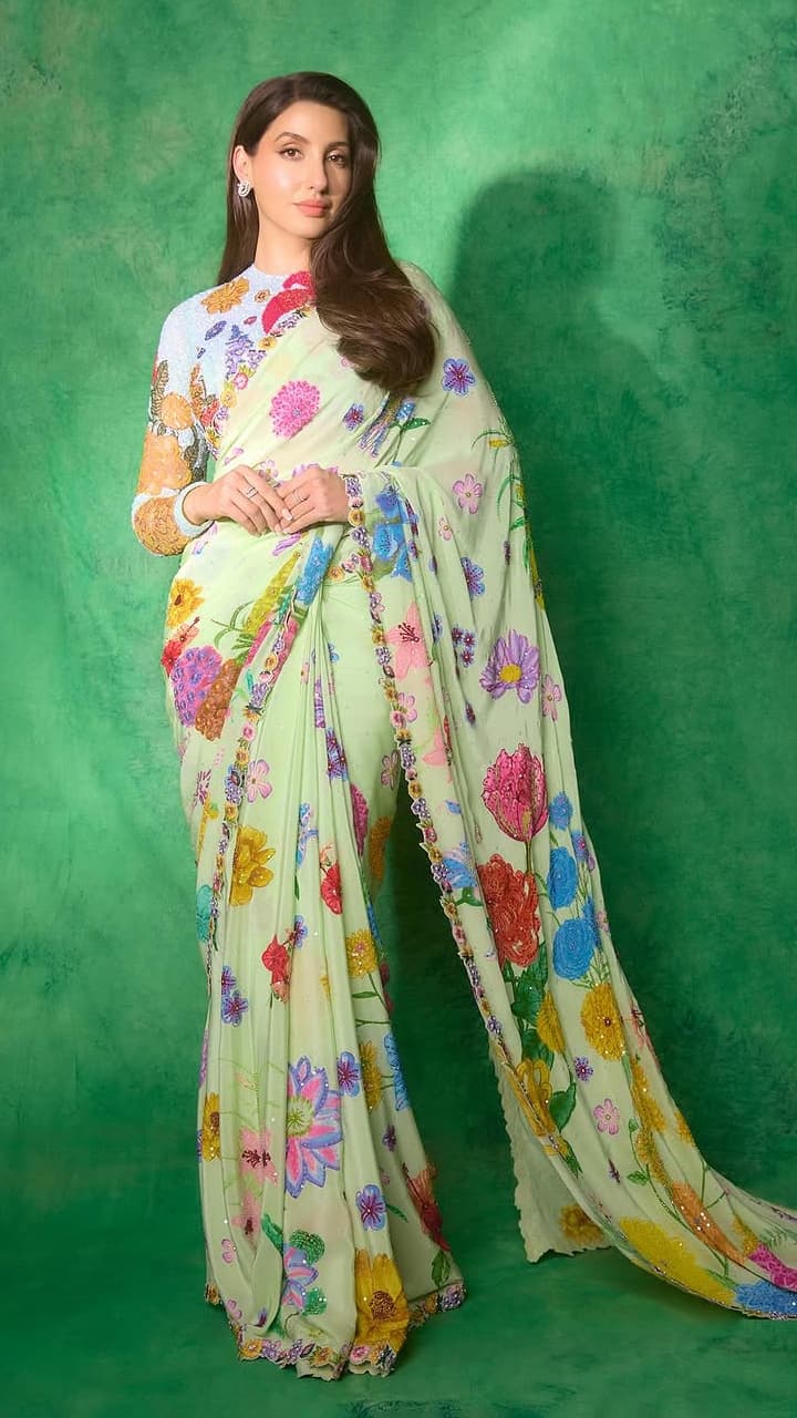 Green color sequence saree is perfect for night party. You can pair bralette blouse with this type of saree. Keep earrings and necklace light, so that the saree can be flaunted.
