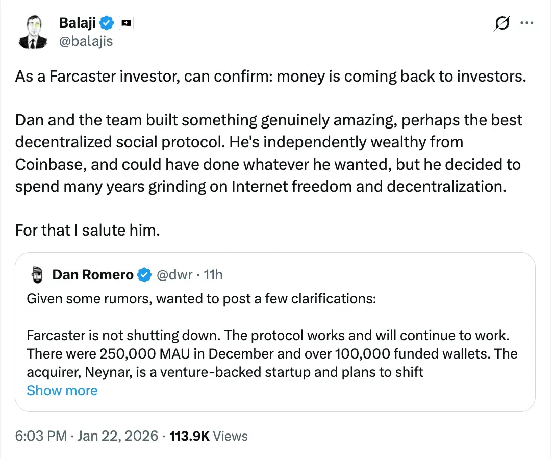 Prominent crypto investor Balaji Srinivasan defended Romero, saying on X that money would be returned to investors and calling Farcaster “perhaps the best decentralized social protocol.” Srinivasan added that Romero was already independently wealthy from his years at Coinbase and chose to spend his time working on decentralization.