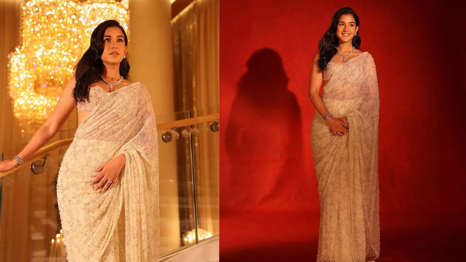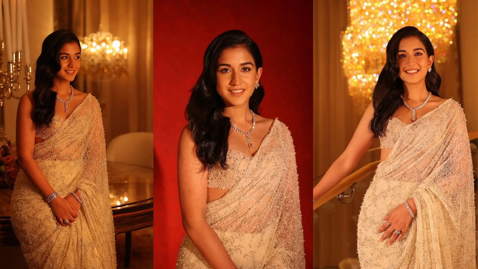 Mother-in-law showed sparkle in her emerald jewellery, so the daughter-in-law was not going to be left behind. Radhika has worn pure diamond jewellery. She is wearing diamond necklace, bracelet and heart shape earrings. Although Nita Ambani may be looking royal in saree, but in the matter of jewellery, Radhika left everyone behind.