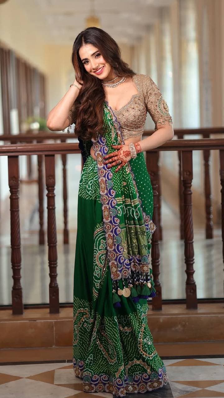 During Sankranti, the new daughter-in-law can dress up in colorful Bandhej print saree. You should wear a Bandhej saree made of green color combination with blue.