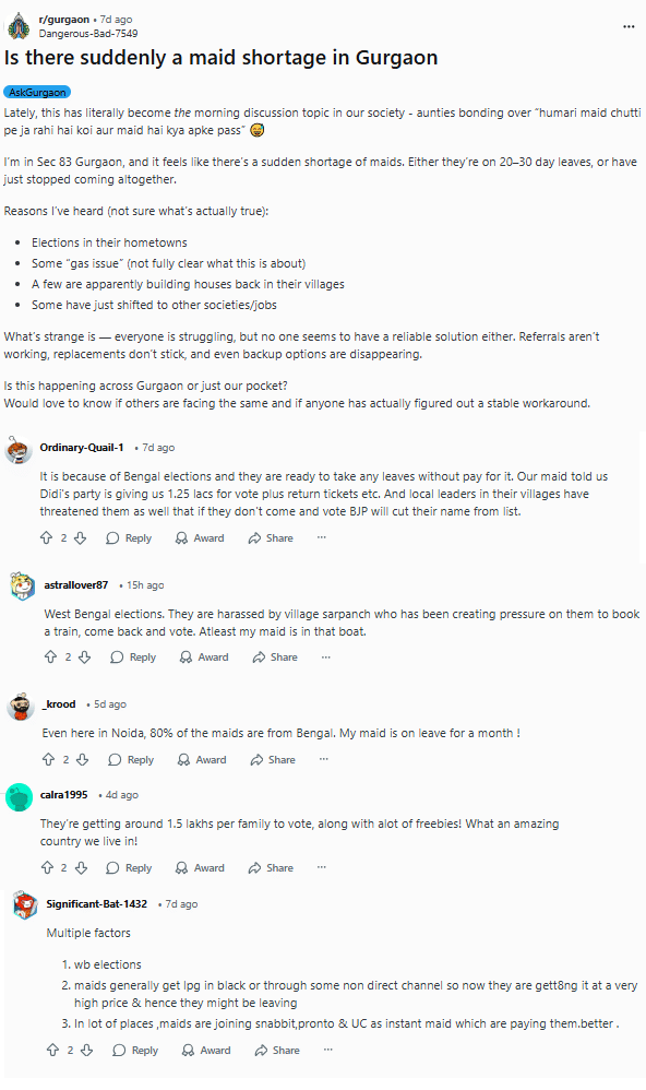 A widely discussed reason on Reddit is the upcoming elections in West Bengal, from where a large number of domestic workers migrate.