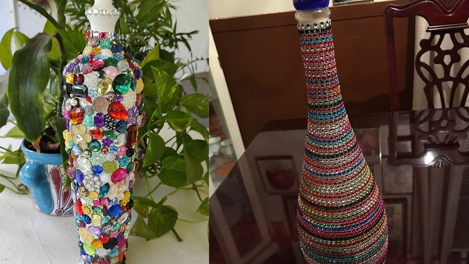 You can also make a beautiful decorative showpiece for your table from old perfume or deo bottles. Add colorful stone detailing on it. Stick it with the help of glue and make a beautiful showpiece.