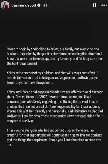 Following the divorce reports, Desmond addressed the situation via an Instagram Story on Sunday, January 11. Apologising publicly, he wrote that he was deeply aware of the disappointment the news had caused.