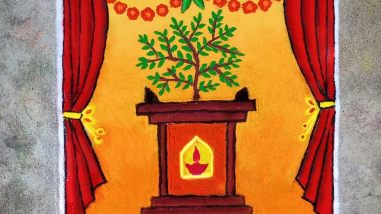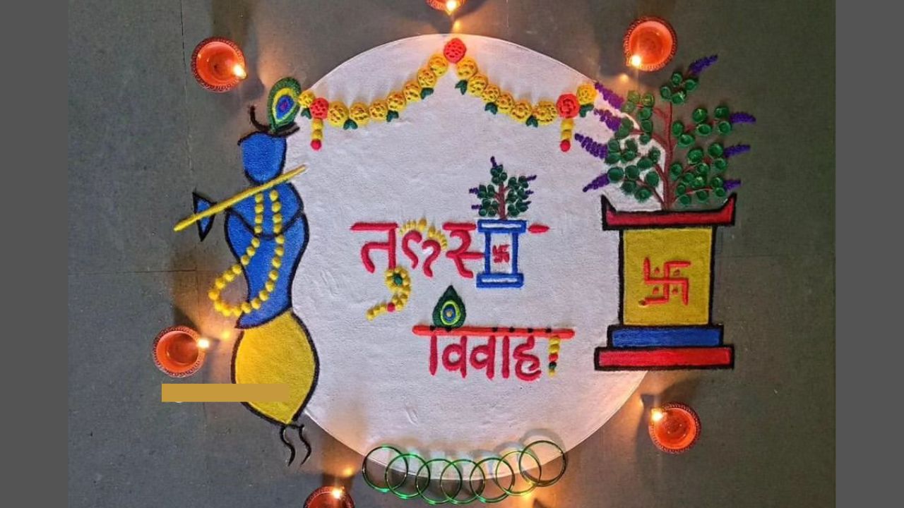 You can also make a rangoli design with Tulsi Vivah written like this in the middle of the courtyard or near Tulsi Chaura. This design is easy to make and visually enhances the beauty of Tulsi Chaura. Based on the theme of Tulsi Vivah, this rangoli can be made in both big and small spaces.