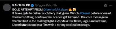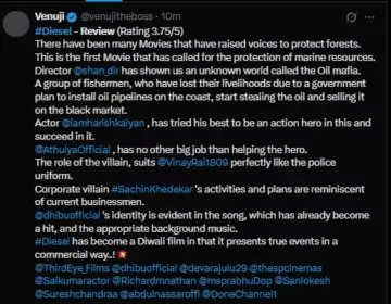 Lauding the performance of Harish Kalyan, a user wrote, Bold attempt from @iamharishkalyan. It takes guts to deliver such fiery dialogues. Watch “#Diesel before some of the hard-hitting, controversial scenes get trimmed. The core message in the 2nd half is the real highlight. Despite a few flaws, lags & melodrama, Diesel stands out as a film with a strong societal message.” Another user penned, “#Diesel races ahead with high-octane action and genuine emotion. @iamharishkalyan commands the screen with fresh confidence. The cinematography adds a raw, realistic texture to the film. Every frame feels energetic & technically strong. Overall, an Excellent commercial entertainer.”