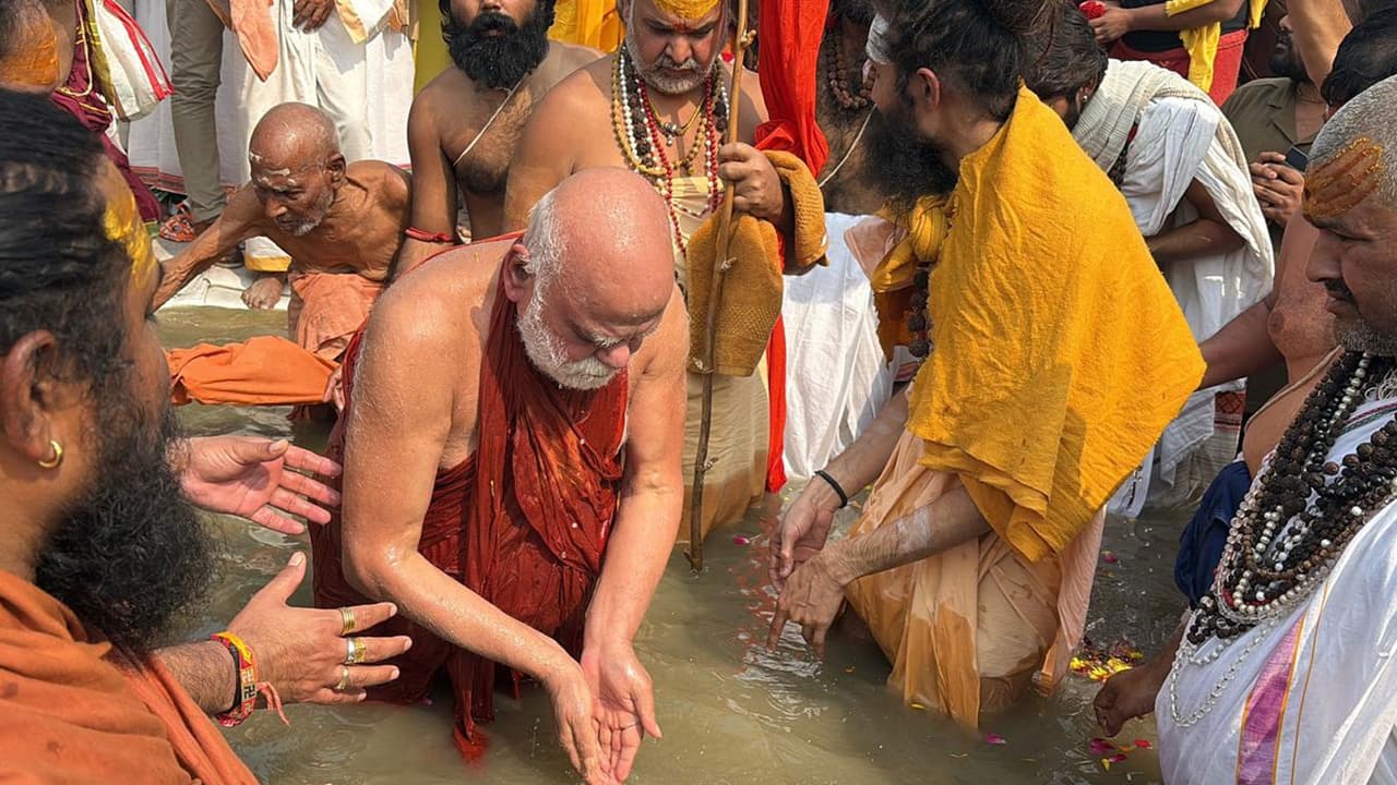 On the fourth major bathing festival of Magh Mela, along with the Kalpavasis, all the prominent saints and religious scholars took holy bath while performing meditation in the fair area. Purvaamnaya Shri Govardhan Math, Puri Peethadhishwar Shankaracharya Swami Nischalanand Saraswati reached Triveni coast with his disciples. Walking on the route prescribed by the administration, they reached Sangam Nose and took bath in Mother Ganga, Yamuna and invisible Saraswati with simplicity and reverence.
