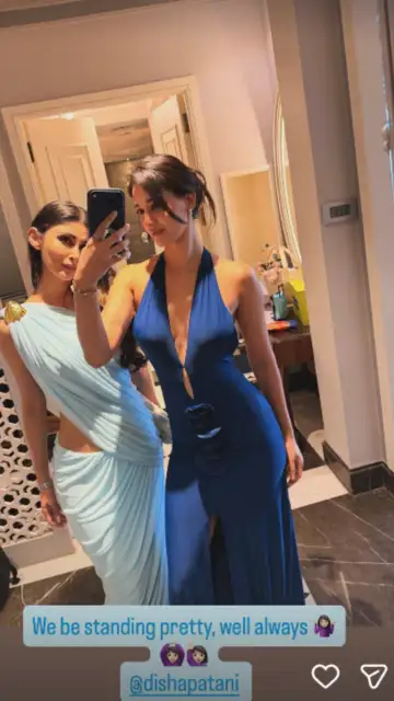 Besties served ultimate BFF goals at the White wedding ceremony. Disha Patani shared the candid picture with the picturesque background of the Fairmont Palace in Udaipur.  In a funny Instagram story, Mouni Roy shared the picture and wrote, “Cray cray is as cray cray does.” Disha Patani stepped out for the white wedding in powder blue bodycon gown. Disha shared the stunning backless look of the outfit on her Instagram, she paired it with earrings & bracelets. “We be standing pretty, well always”, Mouni Roy sharing a mirror selfie with Disha Patani.  Disha & Mouni are known for their loving friendship bond, the Naagin actress made sure to tease fans with calling “Hey Bestie” & a laughing emoji.