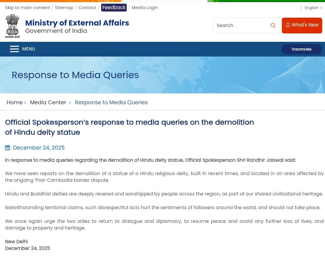 On December 24, the Ministry of External Affairs (MEA) said it had seen reports about the demolition of a statue of Lord Vishnu. The statement was issued by MEA Official Spokesperson Randhir Jaiswal.