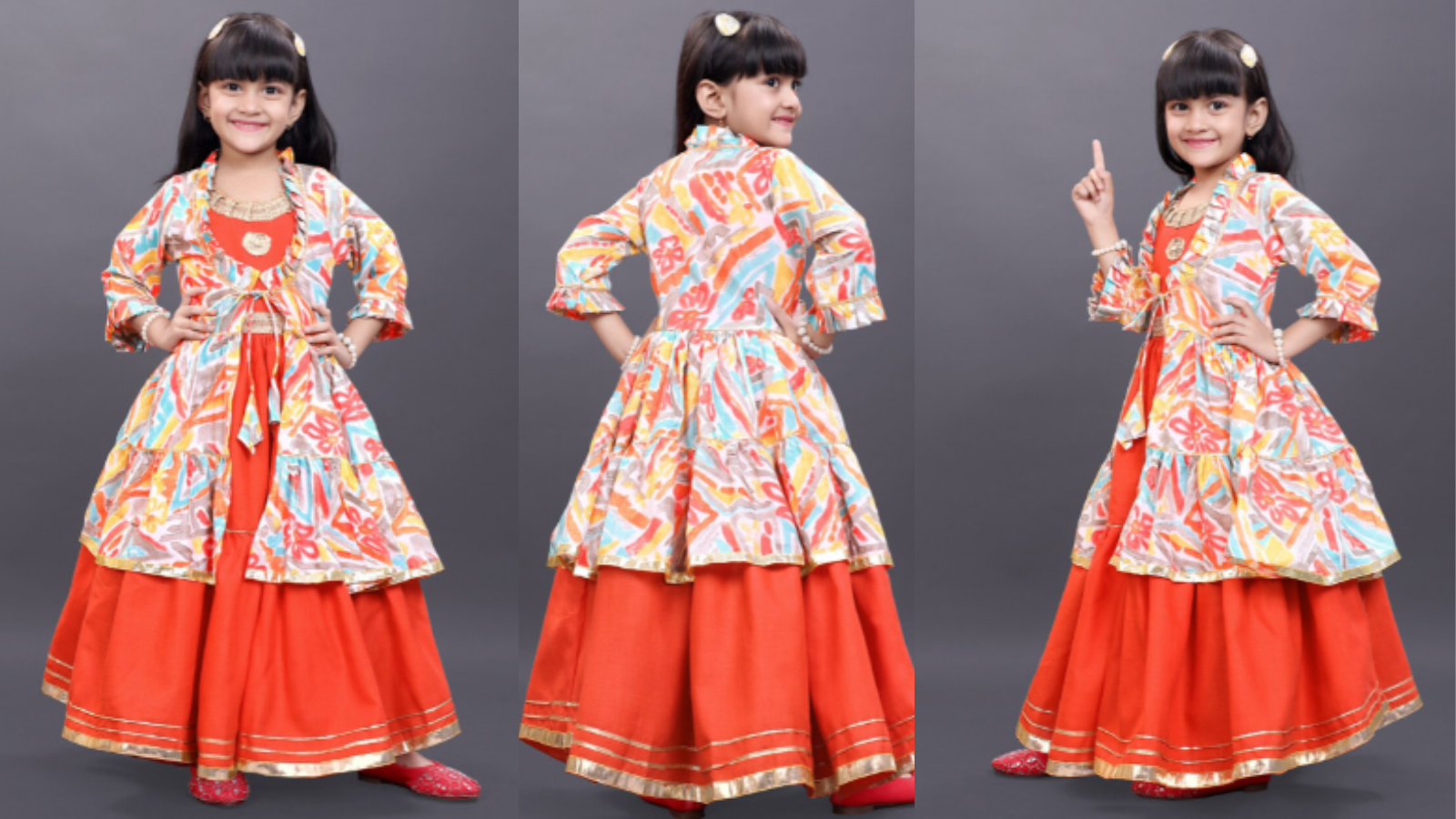 If you like dark colors, then such a dress with orange color and printed shrug will also look lovely on Diwali. It can be purchased from Myntra for ₹598 with 80% discount. It is on cotton fabric. If Lado does not like very heavy outfits then this is an option.