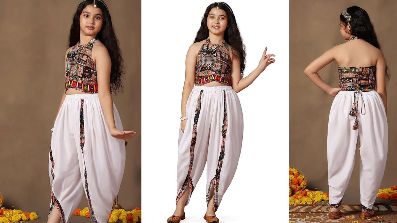 Nowadays the era of crop top with dhoti has returned. In such a situation, your daughter can choose this outfit for Diwali while making Rani look beautiful. This dress, priced at Rs 1,949, is listed at Rs 478 on Amazon with 75% discount. Here a multicolored boat neck crop is given with cotton blend budded white dhoti. For more information you can visit Amazon.