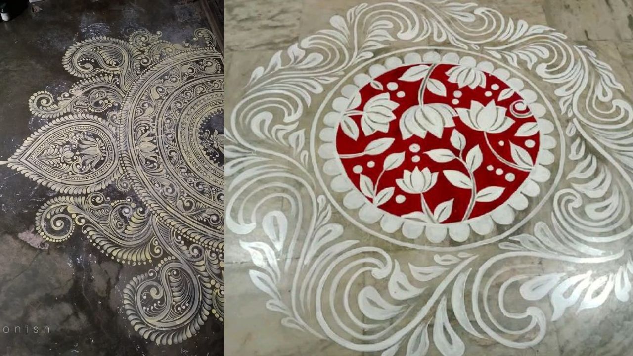 If you want something different from the normal then you can also make this Aalpana Rangoli design. This Bengali style rangoli can be prepared with lime or rice flour solution.