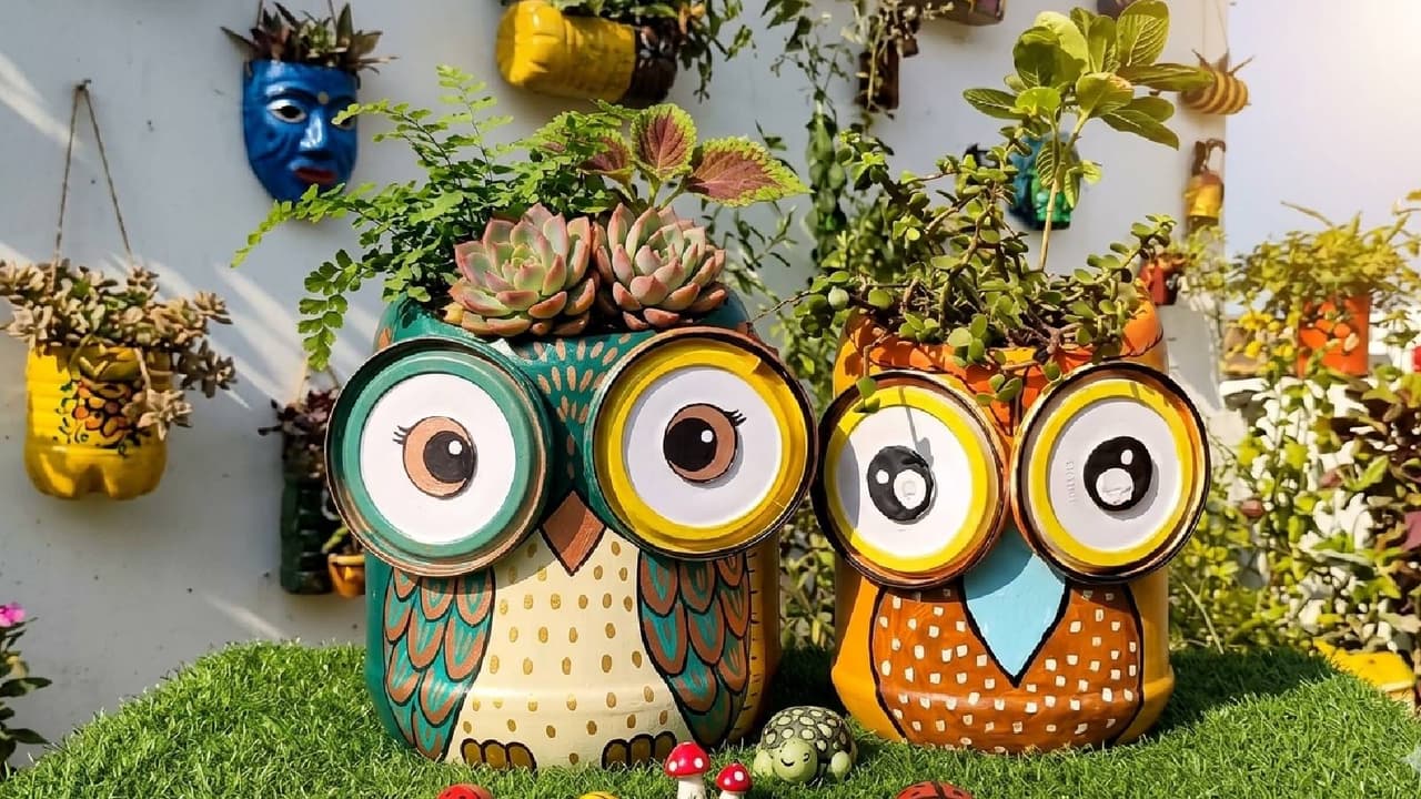 By using old plastic bottles and lids lying at home, you can make a beautiful and cute animal planter. To make an owl shaped planter, use a 5 liter phenyl bottle or oil can bottle. Cut off the top part. Now make 2 round lids by making holes in the box with the help of wire and fix them at the front. In this you can create the look of the eyes by applying black colored eyelashes. Also make a triangular nose with paint or acrylic. Paint it with the color of your choice and plant your favorite small plants in the balcony.