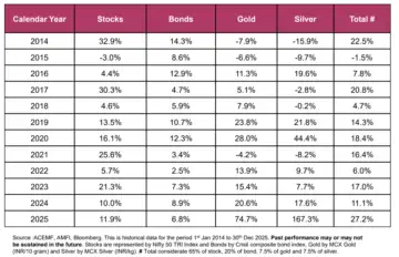 Note: The above table shows the performance of various asset classes over the last 12 calendar years. The last column shows the returns of a diversified multi-asset portfolio with equity (Nifty 50 Index), bonds (Crisil Composite Bond Index), gold (MCX Gold price per 10 grams), and silver (MCX Silver price per 1 kg).
