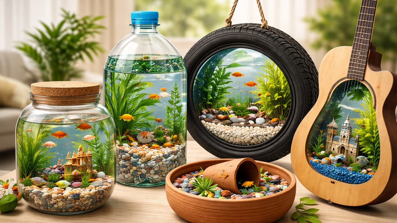 Fish Aquarium Ideas: Make unique DIY fish vases from waste items like old tyres, bottles, jars and guitars. Give your home a creative and aesthetic look with these easy budget friendly ideas.