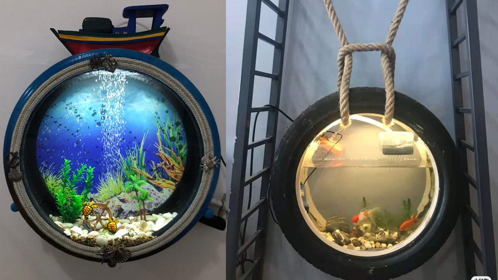 You can also make a unique and trendy fish aquarium by using old tyres. For this, clean the tire and hang it on a stand or rope. Place a base at the back and prepare a fish aquarium by placing transparent glass at the front and adding water plants and stones.