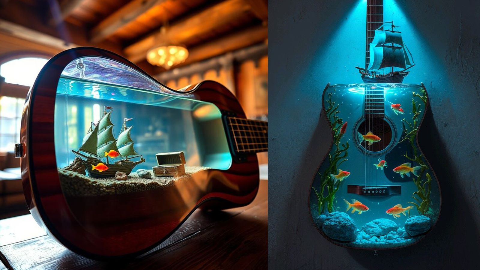 This is a very unique and modern style fish aquarium, which you can make from your old guitar. To make this, cut the front part of the guitar, where the strings are attached. Instead, place a transparent glass, put toy sheep, stones and sand inside the guitar, fill it with water and make a mini fish aquarium in it.