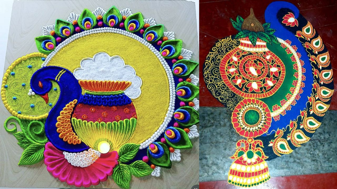 Making Kalash Rangoli designs on the day of Dhanteras is considered auspicious. In such a situation, you can make two lovely designs like this of beautiful kalash and peacock. In this, one design is very intricate, which is famous by the name of Kolam design, while the other peacock and Kalash design is simple, you can make it easily.