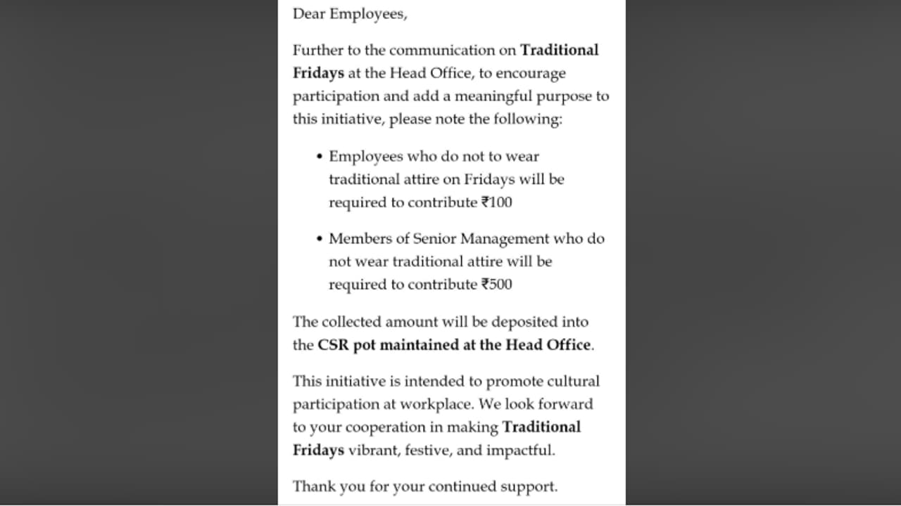 The original poster shared that their company had initially allowed casual Fridays for the first six months of their employment. However, the policy was recently changed to require “formal/traditional” attire on Fridays. While colleagues generally complied, the poster acknowledged they personally didn’t own simple Indian ethnic wear and saw no practical reason to invest in it. When HR circulated an email enforcing the new dress code, the employee responded with a mix of exasperation and humour, joking about turning up in a lehenga to make a point.