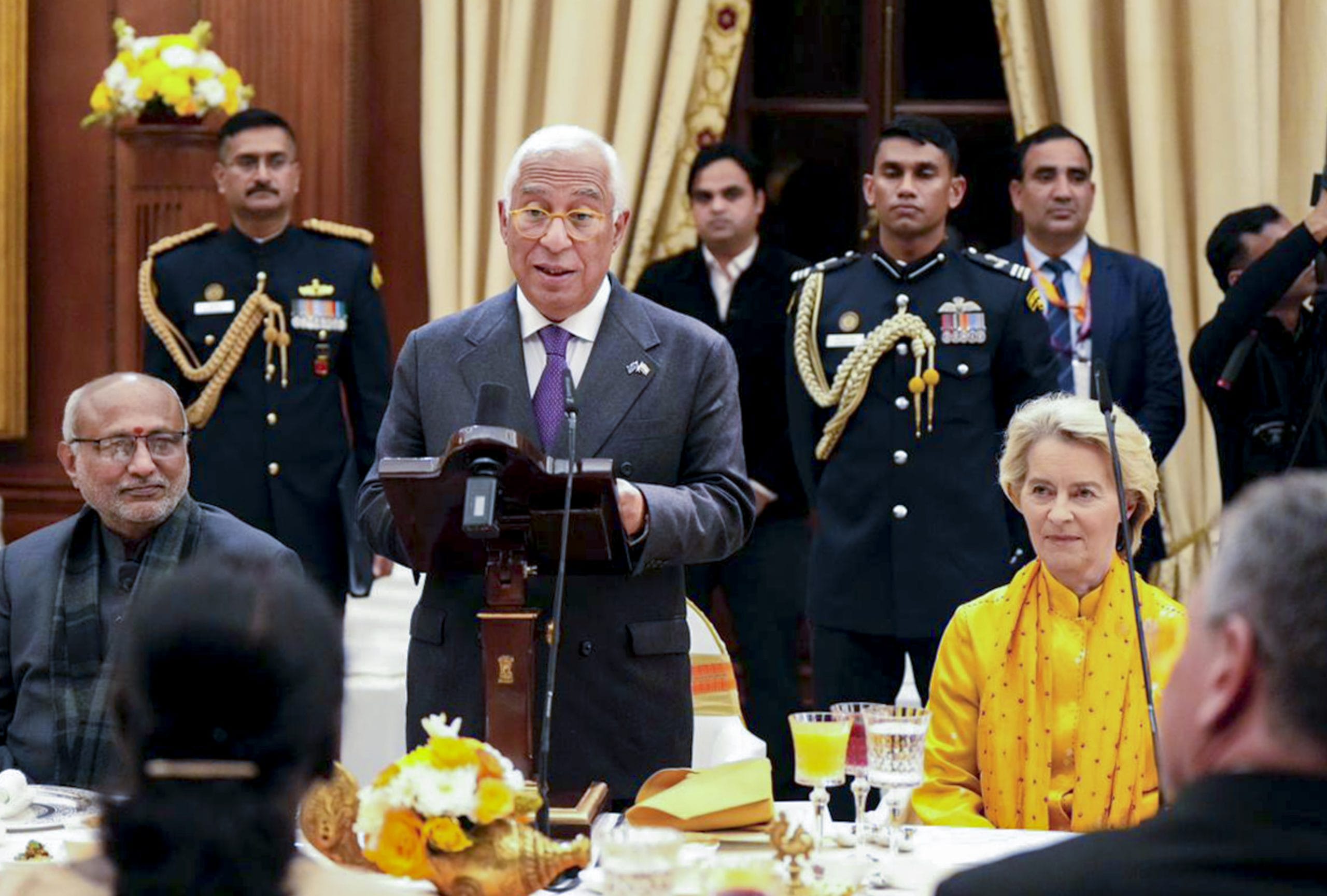 Rashtrapati Bhavan, the official residence of India’s President, stands as an architectural marvel in Delhi, with its vast Durbar Hall often hosting pivotal diplomatic encounters. On this occasion, President Droupadi Murmu received António Costa and Ursula von der Leyen shortly after they served as chief guests for the Republic Day parade – a first for an EU contingent including military staff from operations like ATALANTA and ASPIDES.