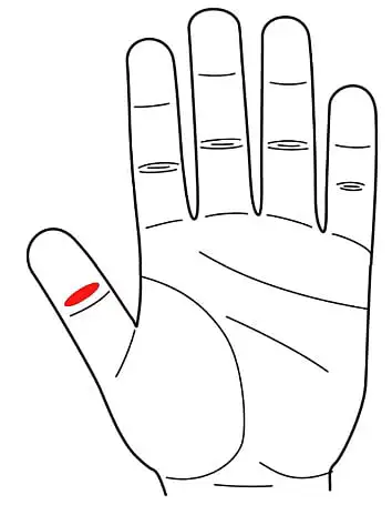 Highlighted area (see figure) is corresponding point for lips. If lips are not bleeding and only dry and chapped, apply a red colour and wheat seed or flat apple seed. Keep the seeds on for three to four hours or overnight if you are comfortable.