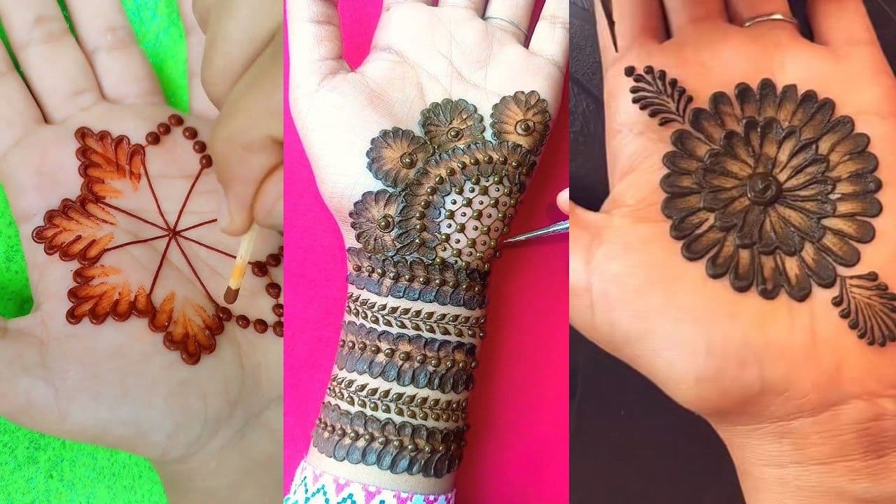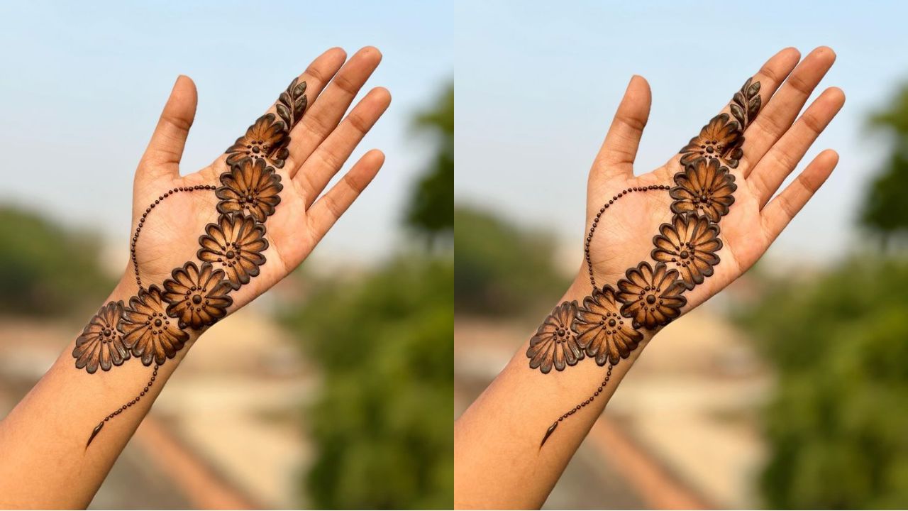 You can make a very beautiful three flower design in the backhand with the help of earbuds. This mehndi design is very easy to make and looks very beautiful after making it. First of all, clean the back side of the hands and then make three round dots in the middle with a cone. Now surround these points with dots on all sides, as seen in the image. Now everyone has to pull them towards the middle with the help of earbuds, as seen in the image. When the design is made from all the points, you can also make a vine or thread like design around it, which will make these three flowers look more beautiful.