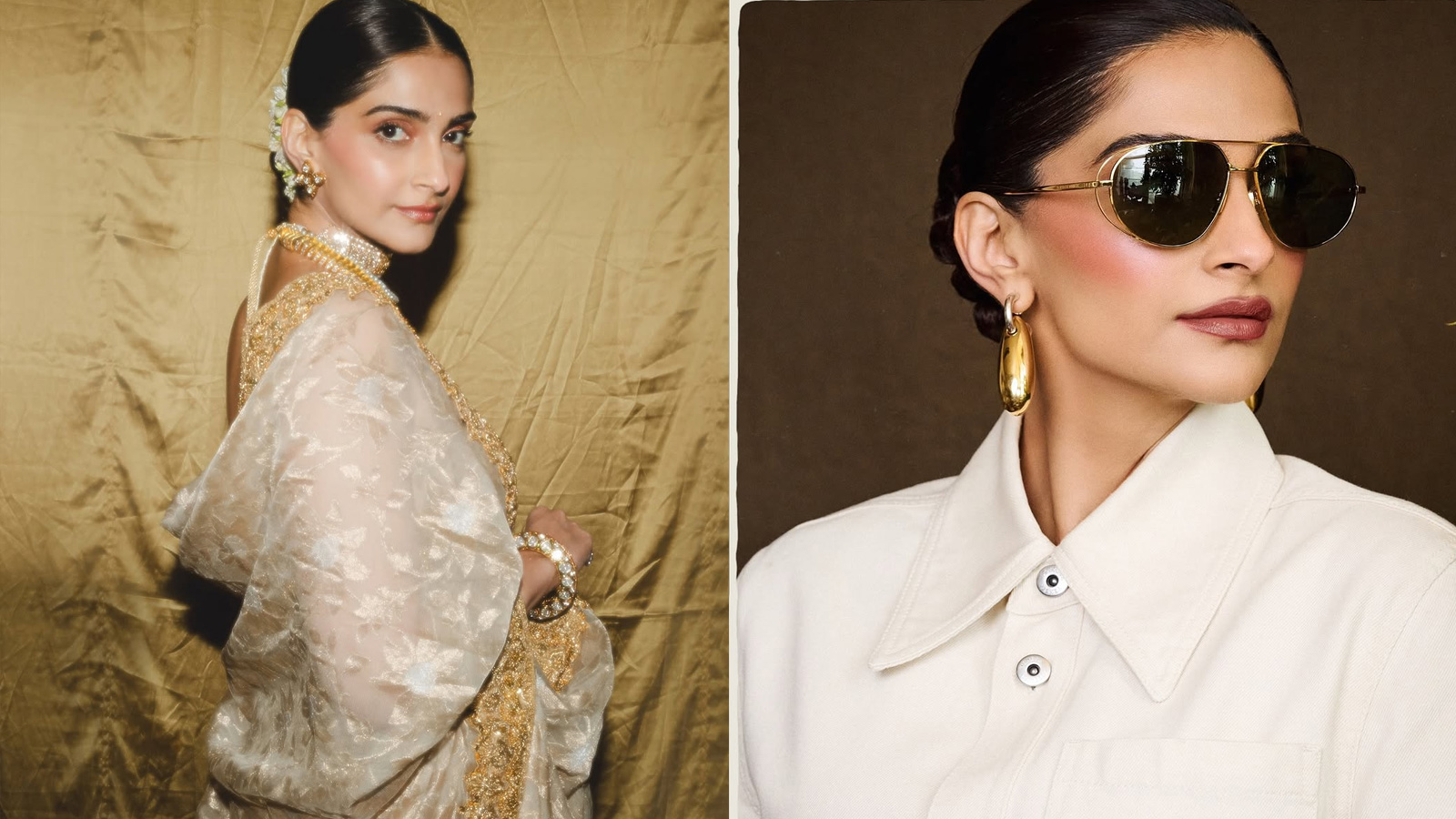 In this picture, Sonam Kapoor is seen in two completely different but stylish earring looks. In the first look she is wearing golden studs. In which diamond is studded. Whereas, in the second look, Sonam is wearing oversized gold hoops, which shows her modern and bold style. Both the earrings beautifully showcase her classic and experimental fashion sense.