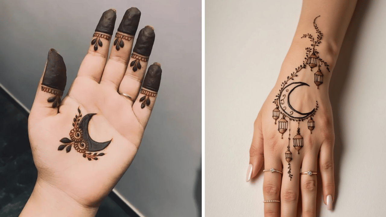 Featuring a central half-moon with stars, hanging chains, or floral chandeliers, this Eid emblematic design evokes Chand Raat’s magic for 2026 celebrations. Simple yet poignant on palms, it requires minimal time, perfect for last-minute applications, and complements gold bangles for a spiritual, photogenic finish.