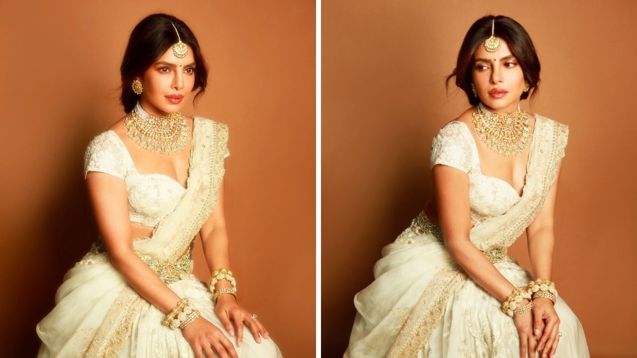 Priyanka Chopra wore a white colored organza silk flowy lehenga, the bottom of which was made of white colored silk with floral detailing and a zigzag cutting hemline with golden embroidery on the border. The actress also wore a blouse with cap sleeves and sweetheart shape neckline. The finishing touch to the lehenga set has been given by draping the dupatta on the left shoulder.