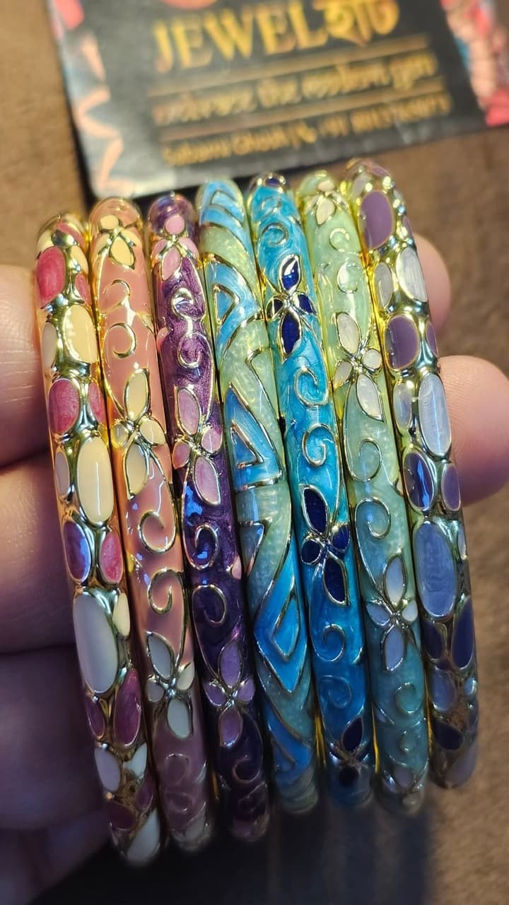 Enamel bracelets are made with colored enamel coating on a metal base. Bright colors, floral patterns, geometric designs and fine artwork are seen in these.