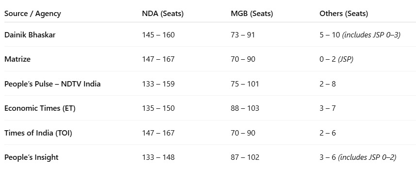 Three recent exit-poll surveys paint a confident picture for the NDA in Bihar’s Assembly elections. For example, the survey by Dainik Bhaskar projects the NDA to win 145-160 seats, with the Mahagathbandhan (MGB) at 73-91 and others at 5-10. The poll by People’s Insight puts the NDA at 133-148 seats, MGB at 87-102, the Jan Suraaj Party (JSP) at 0-2, and others at 3-6.