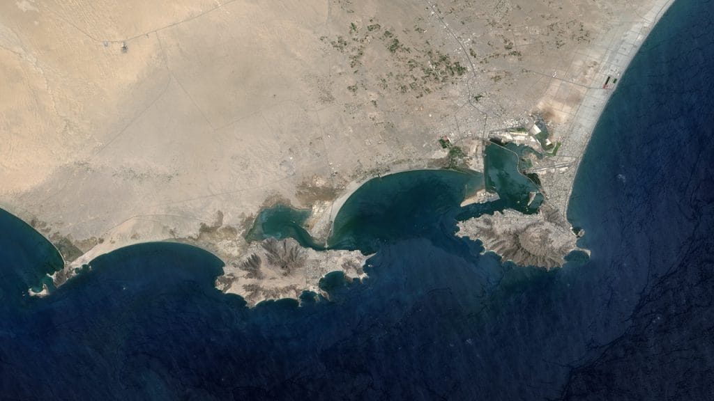 A Natural satellite view of the seaport city of Aden April 22, 2015 in Aden, Yemen. The city lies east of the Bab Al-Mandab strait. (Photo by USGS/NASA Landsat/Orbital Horizon/Gallo Images/Getty Images)