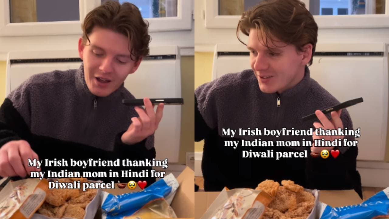 In a viral video, an Irish guy is thanking his Indian girlfriend’s mother for her Diwali gift in Hindi. His efforts to speak in Hindi are being greatly appreciated on social media. This video is winning people’s hearts.