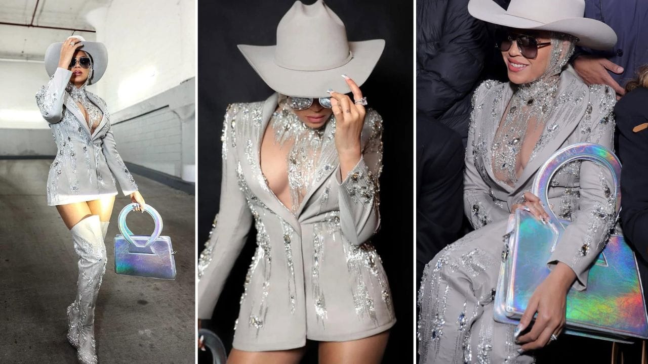 At New York Fashion Week, Beyoncé attended the Luar show in a celestial grey embellished blazer dress paired with a hooded sheer bodysuit and thigh-high boots. Accentuating the cowgirl theme, she added oversized sunglasses, a holographic Luar bag, and her signature cowboy hat. The ensemble came from Gupta’s ‘Aarohanam’ collection, fresh from Paris Couture Week, reflecting elegance with a modern twist.