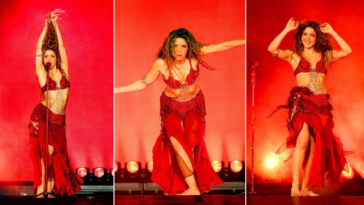 During her Indian tour stops, Shakira dazzled in a fiery red two-piece set by Anamika Khanna. The bralette featured intricate threadwork, shimmering beads, Swarovski crystals, and diamond embellishments, paired with a flowing layered skirt with feather detailing at the waist. The ensemble amplified her energy on stage while adding drama and elegance to her performance.