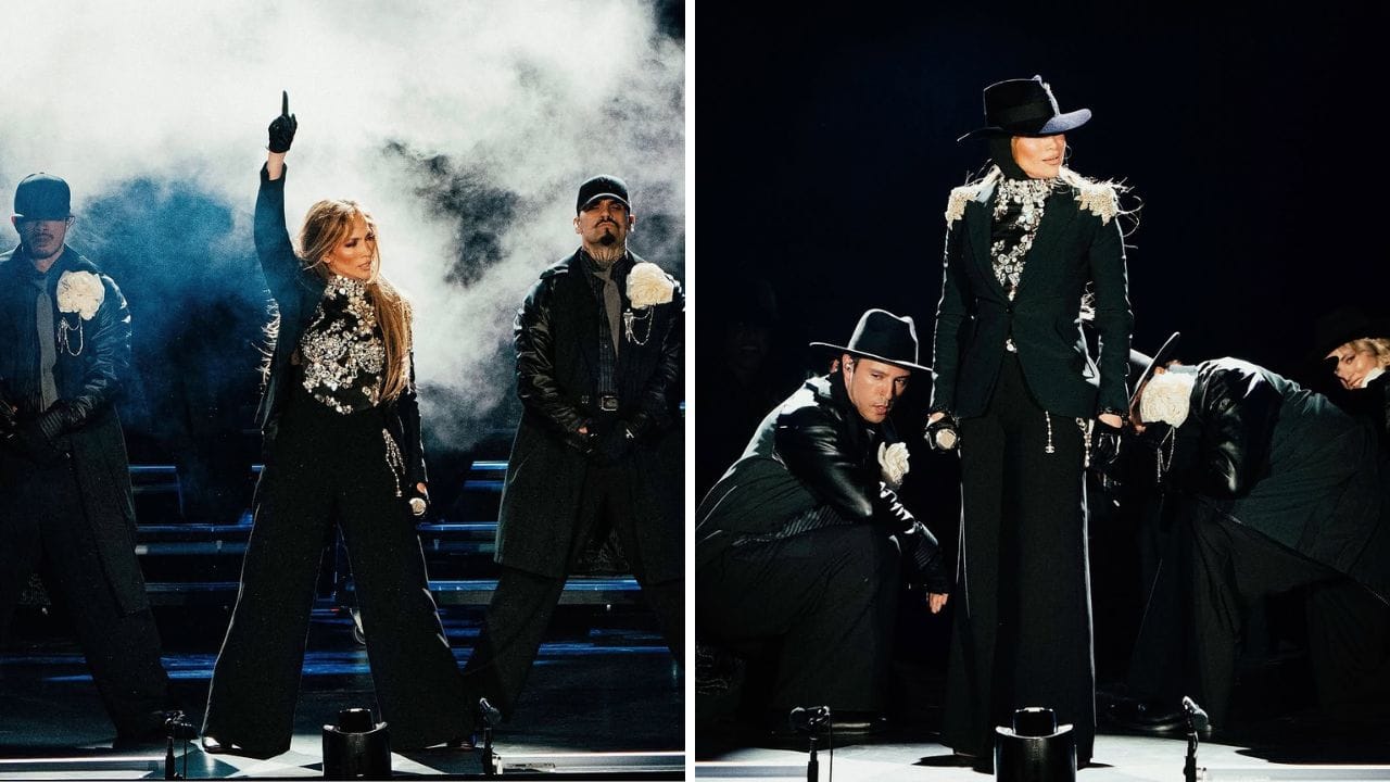 At Saadiyat Nights, Jennifer Lopez performed in a black ensemble with crystal embellishments on a high-neck top and tailored blazer. The outfit combined elegance and functionality with breezy trousers, sleek black heels, gloves, and a black hat. The couture look allowed freedom of movement on stage while commanding attention through intricate detailing and haute couture sophistication.