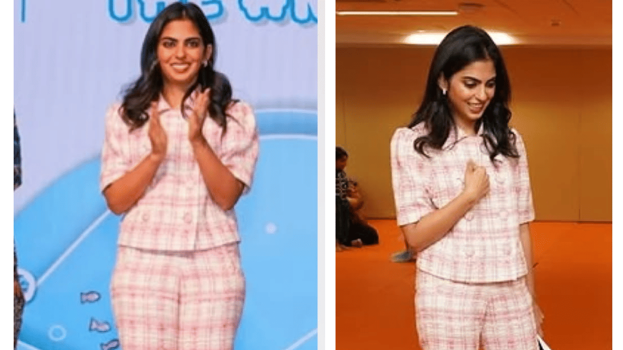 Isha nailed effortless chic in a puff-sleeve, double-breasted pink-white tweed jacket paired with matching cropped trousers, striking a perfect balance between comfort and high fashion. The minimalist vibe, cropped sleeves, and soft palette made it a street-style sensation, inspiring countless recreations across social media.