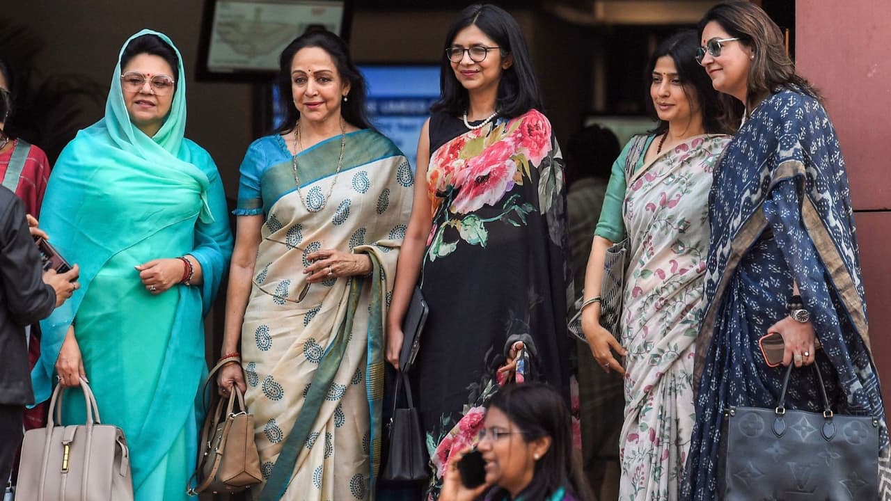 From Kangana to Hema Malini and Dimple-Priyanka Gandhi, such pictures of women MPs were seen for the first time. Bjp Mp Hema Malini And Sp Mp Dimple Yadav Swati Maliwal Priyanka Gandhi At Parliament Premises During The Budget Session