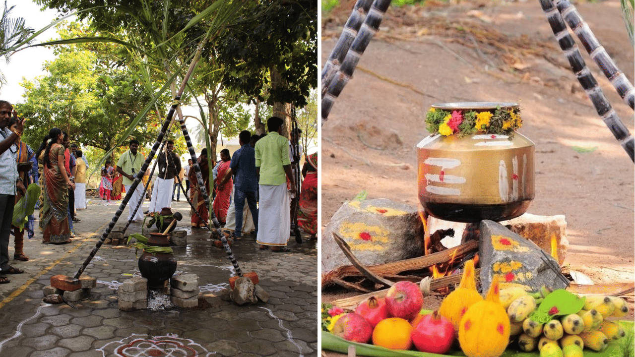 Pongal boiling ceremony: On Thai Pongal, new clay pots boil rice, jaggery, and milk outdoors till overflowing amid “Pongalo Pongal!” cheers, invoking Sun God’s blessings for abundance and wealth.
