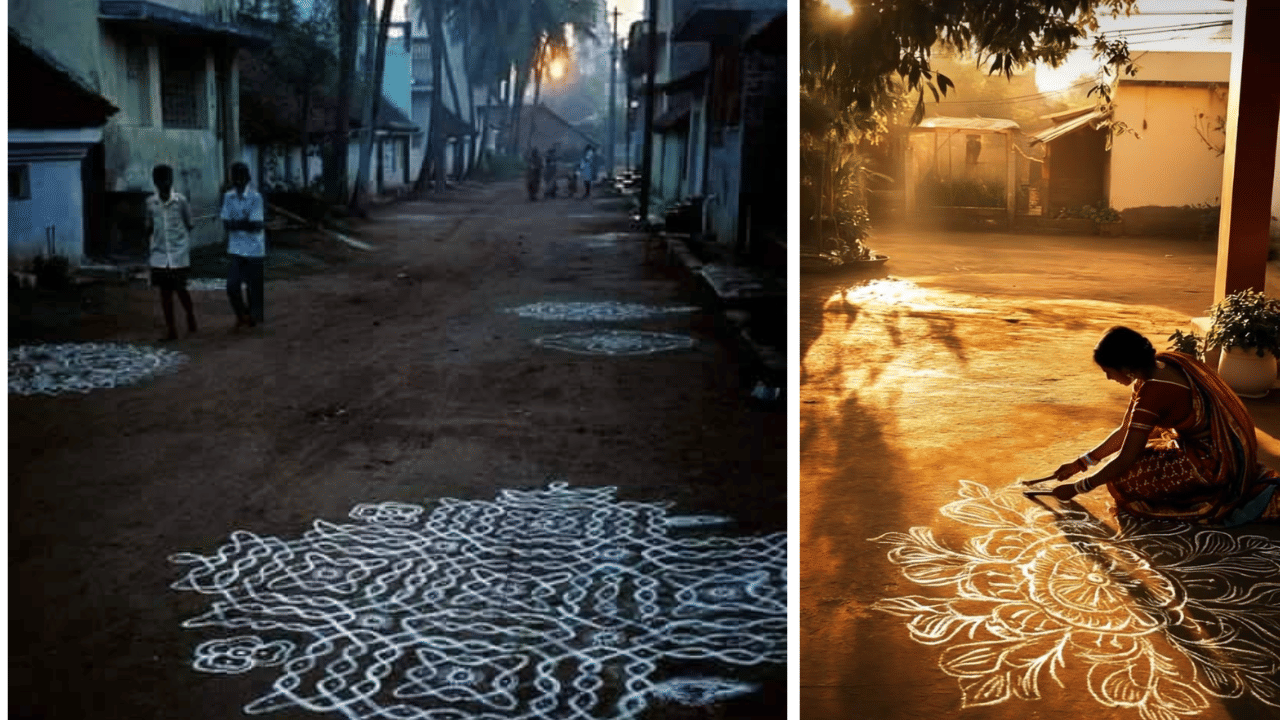 Kolam designs: Women craft intricate rice flour rangolis at dawn with floral motifs and sweets, welcoming prosperity; bordered in red clay, they beautify courtyards throughout the festival.