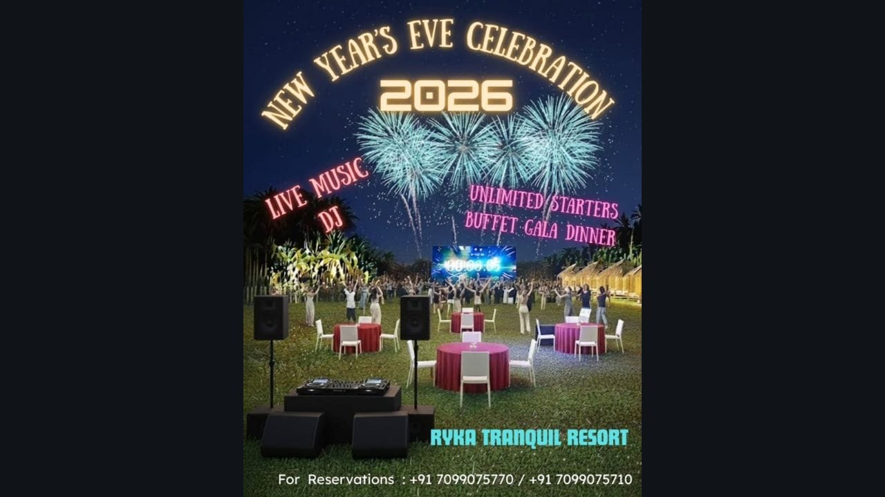 A poolside celebration under the open sky at Ryka Tranquil Resort. The evening includes a multi-cuisine gala buffet, unlimited starters and soft drinks, DJ-led music, and relaxed seating by the pool, making it ideal for those who prefer a laid-back yet festive New Year welcome.