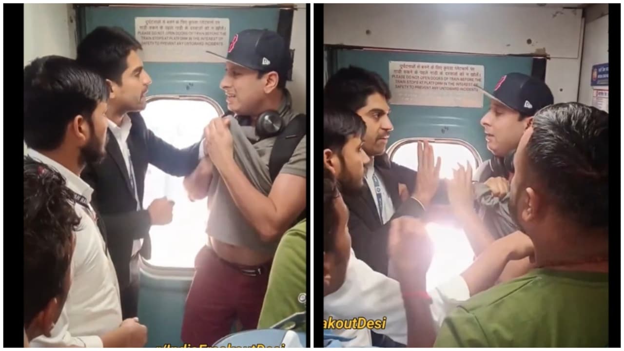 <p>A video of a heated clash between a travelling ticket examiner (TTE) and a male passenger aboard an Indian Railways train, with the passenger accused of travelling without a valid ticket, has gone viral on social media.</p><p>The clip, filmed inside a packed coach, shows heated physical confrontation between the TTE and passenger in the narrow aisle near the train door. Two uniformed TTEs are seen closing in on a male passenger, with one officer gripping him by the arms and collar. Visibly distressed, the passenger struggles to break free, shouting, “Chhod do mujhe! Kyun pakad rahe ho?” (Leave me! Why are you holding me?).</p><p>As chaos erupt, TTE is heard saying, “Ticket dikhao! Bina ticket ke ghoom rahe ho!” (Show your ticket! You’re travelling without one!), while tugging at the man’s shirt and demanding identification. The situation escalates rapidly as the passenger raises his hands defensively and yells, “Reservation hai mera! Mat chhuo!” (I have a reservation! Don’t touch me!), even as shoving and wrist-grabbing continue in the cramped space.</p><p>The TTEs warns, “Station pe police ko bulaayenge!” (We’ll call the police at the station).</p><p>Kalesh b/w TCe and Passenger over travelling without ticket:&nbsp;pic.twitter.com/tg4hq2CIwu</p><p>— Ghar Ke Kalesh (@gharkekalesh) December 16, 2025</p><p>Fellow passengers can be heard urging both sides to calm down, while several commuters record the altercation on their phones.</p>