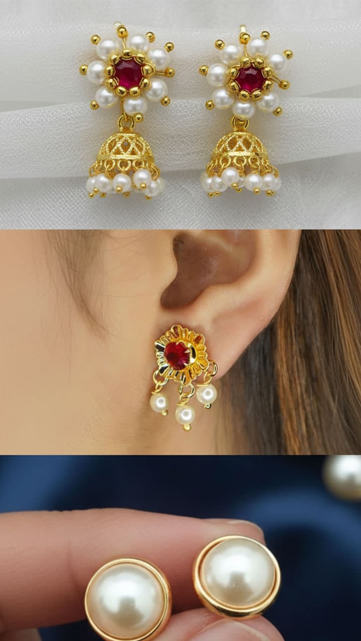 You can choose stud earrings for daily wear. Studded with gold wire, this earring has a red stone in the center and pearl detailing on the sides.