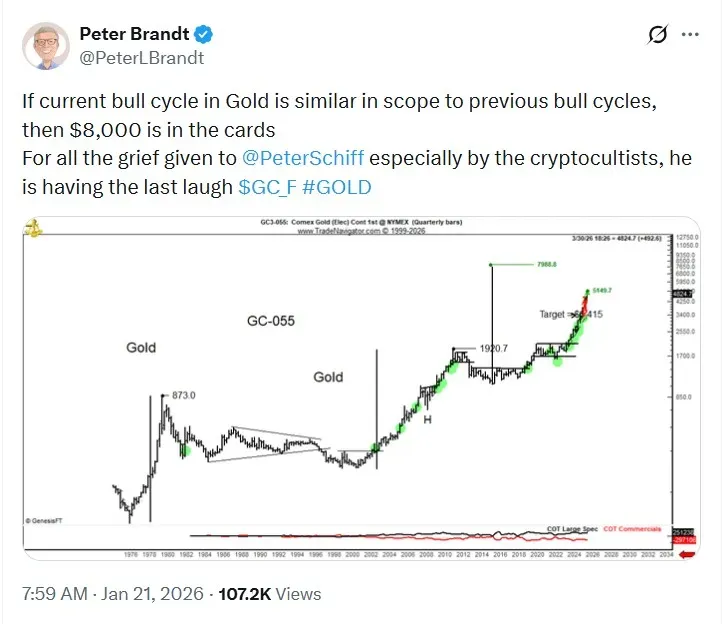 Veteran trader Peter Brandt said gold prices reaching $8,000 is on the cards if the current bull cycle is similar to the previous ones.