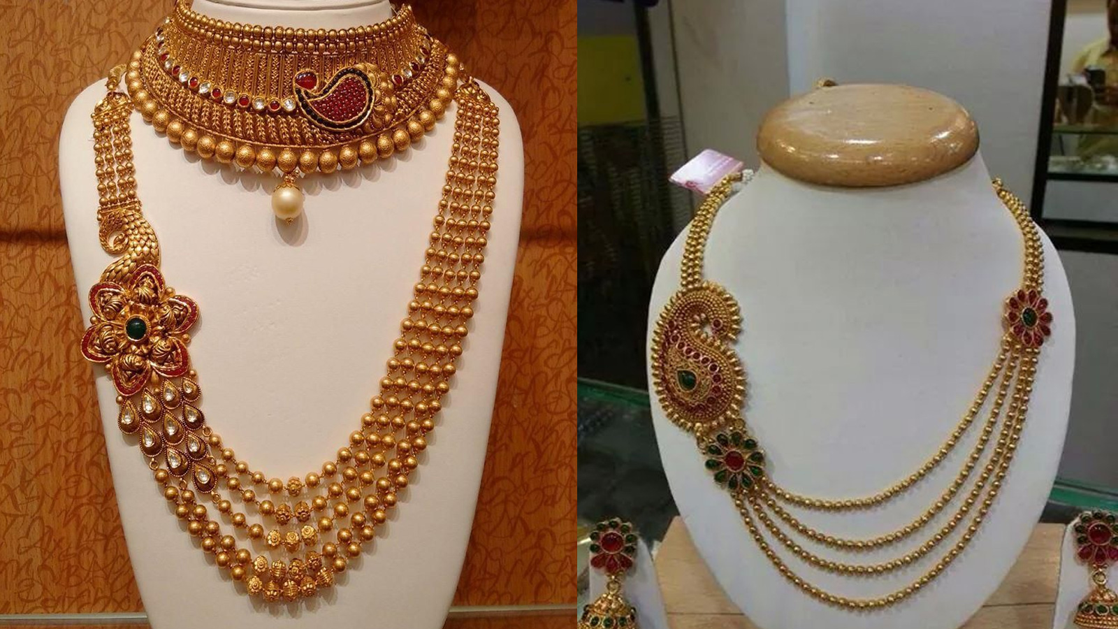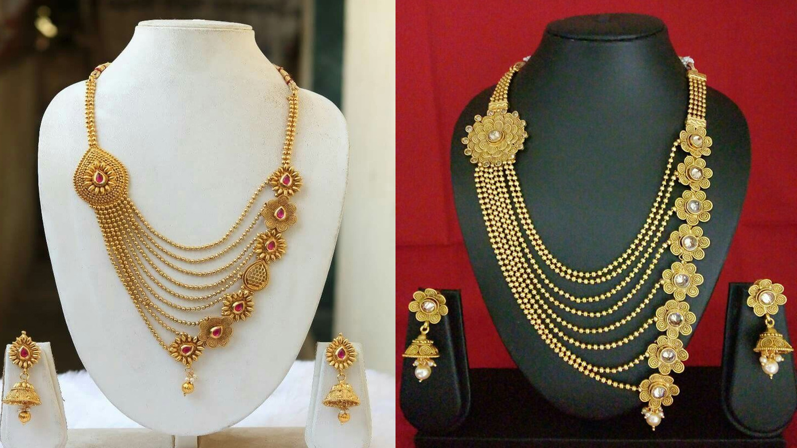Two designs of Chandrahar are shown here. Both are very beautiful. A Chandrahar is of 5 layers, in which golden beads are attached. Matching earrings are also provided with it. You will get this design of gold plated Chandrahar for Rs. 3 thousand. However, it will be a little expensive in silver. A little modern touch has been given in the second design. Chain has been attached on both sides of the big size beads.